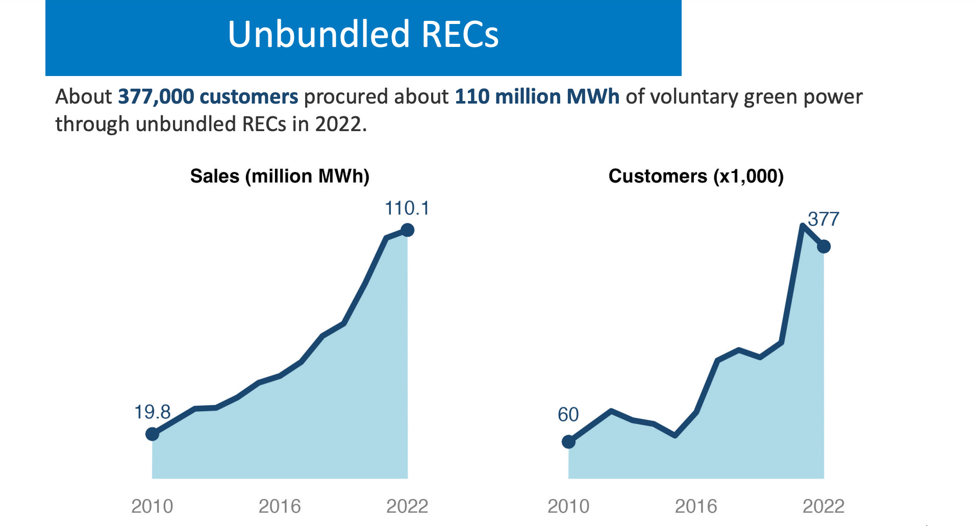 Even for the physics-illiterate corporate and government entities involved in the RECs sham, the path of least resistance is an iron law, and business is booming. The graphs below, from the National Renewable Energy Laboratory (NREL), show the increase in overall sales and corporate purchasers of unbundled RECs from 2010 to 2022 (the most recent report).